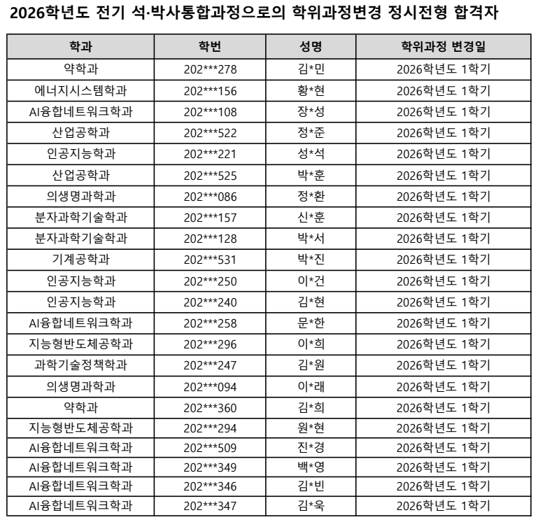 2026학년도 전기 석박사통합과정으로의 학위과정 변경 모집 (정시)전형 합격자 공지