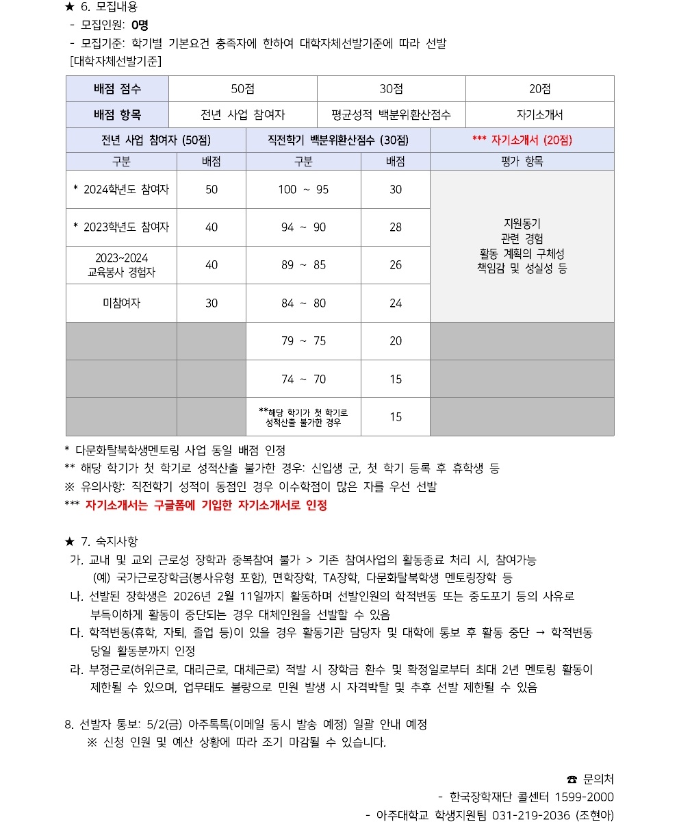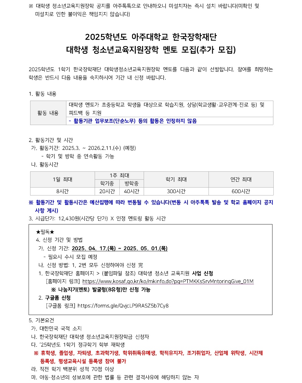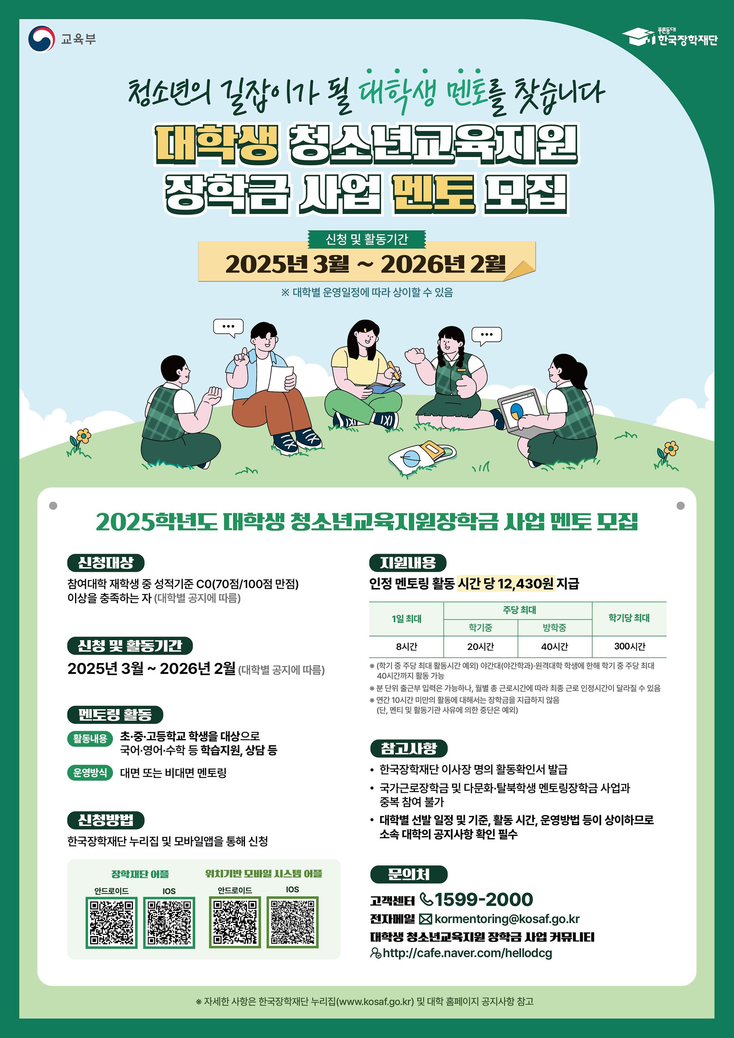[장학] [학생지원팀] [조기마감] 2025학년도 대학생 청소년교육지원장학금 멘토 추가 모집 (~5/1)