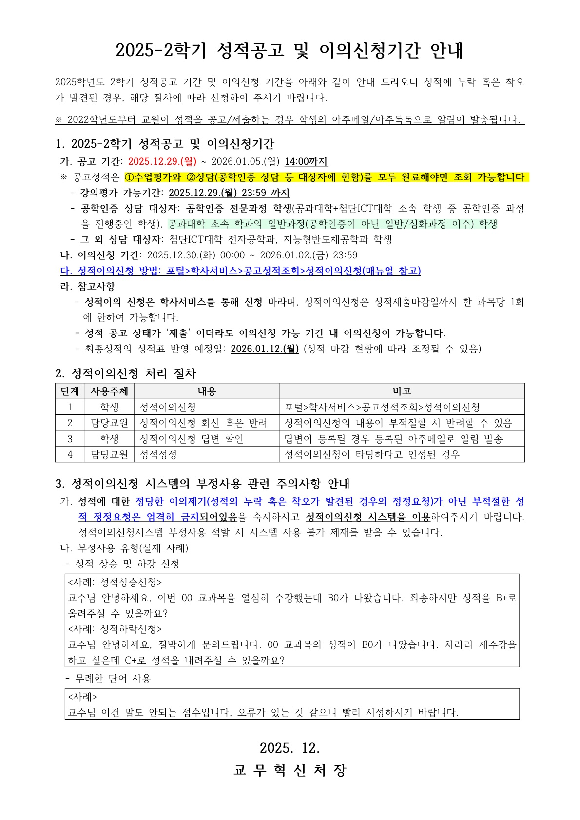 [공지] [학부/학사과정] 2025-2학기 성적공고 및 이의신청기간 안내