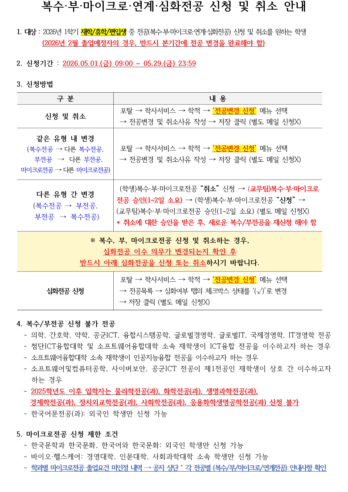 [학사] [학부] 전공(복수,부,마이크로,연계,심화전공) 신청 및 취소 기간 안내 (5.1.~5.29.)