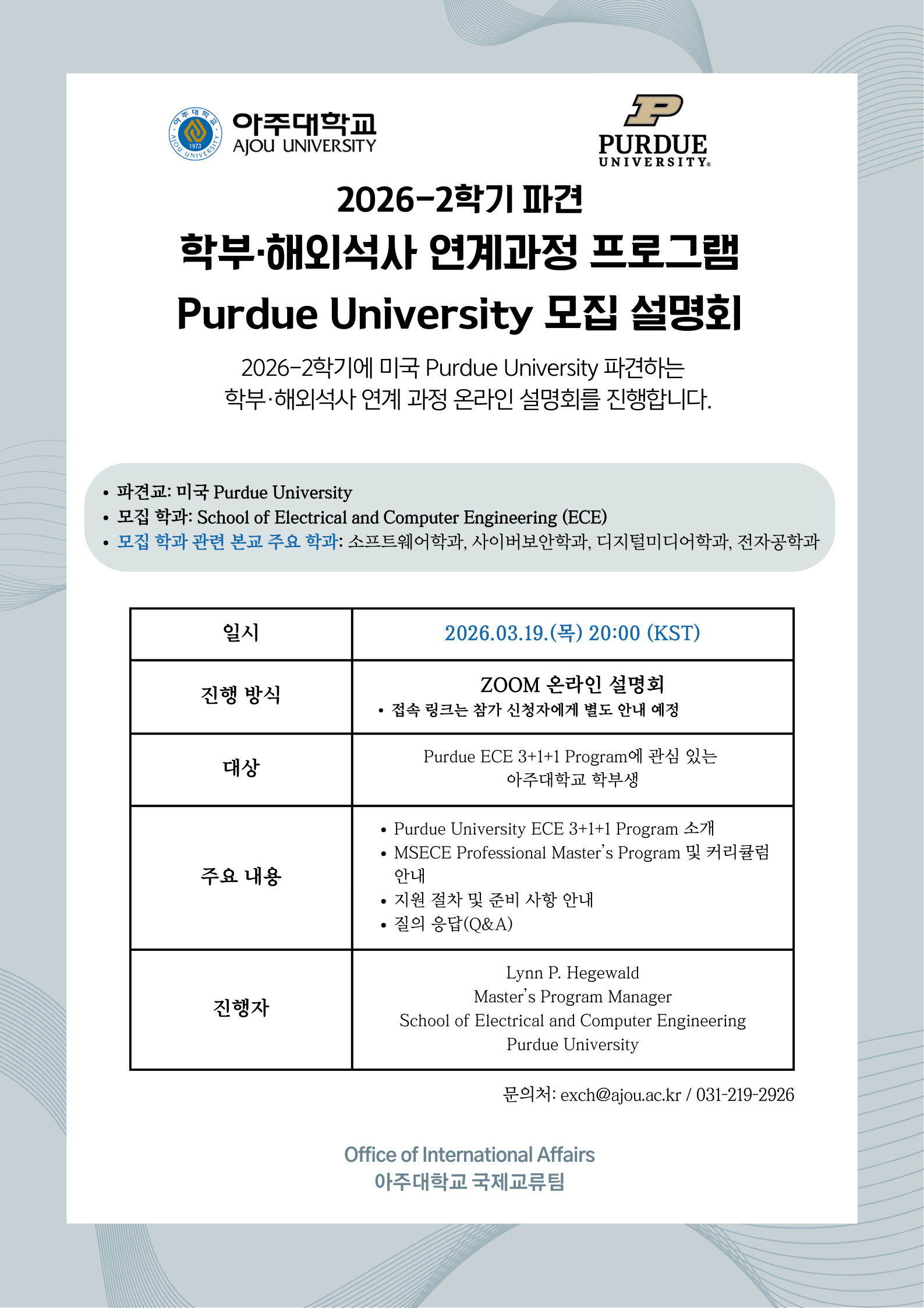 [공지] [국제교류팀] 2026-2학기 파견 학부·석사 연계과정 프로그램 설명회 안내(미국 Purdue University)